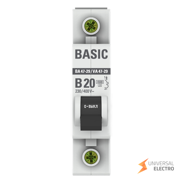Автоматический выключатель 1P 20А (B) 4,5кА ВА 47-29 Basic предназначен для защиты электрических цепей от перегрузок и коротких замыканий. Он оснащен одной полюсной секцией и рассчитан на номинальный ток 20 ампер. Устройство имеет отключающую способность 4,5 кА, что делает его подходящим для использования в бытовых и коммерческих системах электроснабжения.