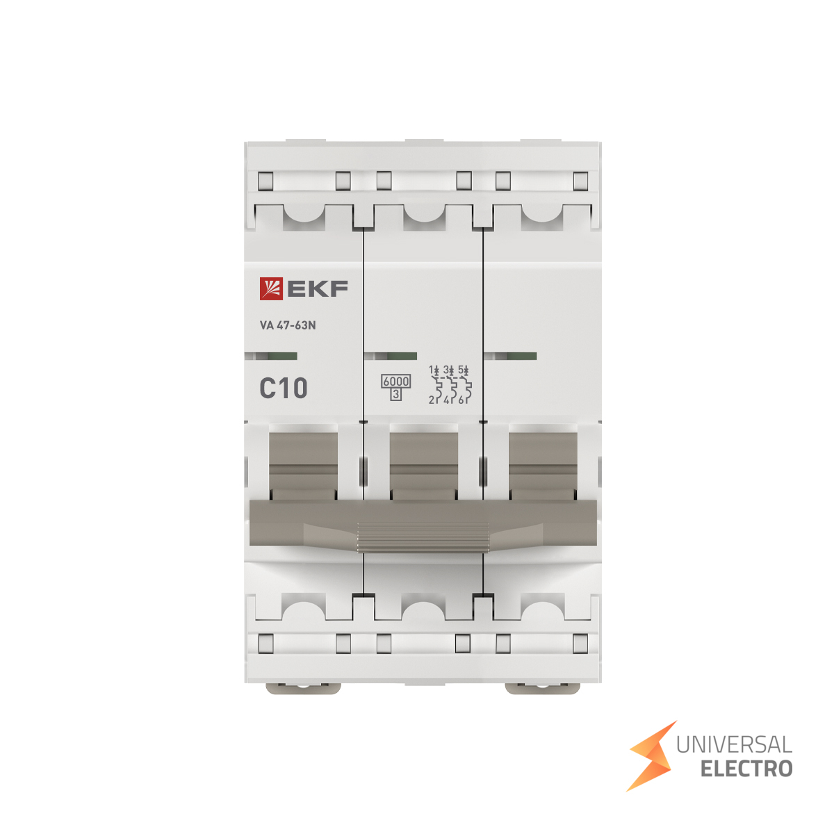 Автоматический выключатель 3P 10А (C) 6кА ВА 47-63N EKF PROxima предназначен для защиты электрических цепей от перегрузок и коротких замыканий. Он оснащен тремя полюсами и рассчитан на номинальный ток 10 ампер. Устройство обеспечивает надежную работу в сетях с номинальной отключающей способностью 6 кА. Подходит для использования в жилых и коммерческих зданиях.