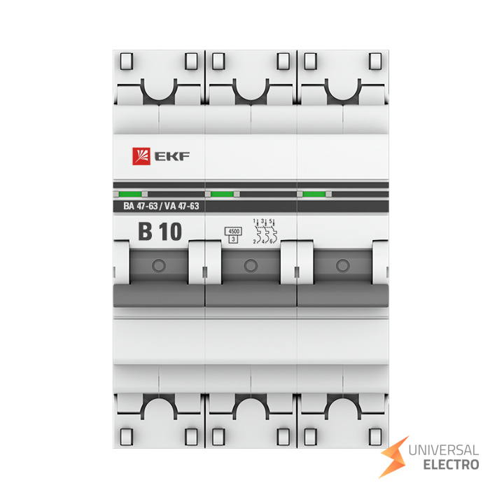 Автоматический выключатель 3P 10А (В) 4,5kA ВА 47-63 EKF PROxima предназначен для защиты электрических цепей от перегрузок и коротких замыканий. Он имеет три полюса и рассчитан на номинальный ток 10 ампер. Выключатель способен выдерживать ток короткого замыкания до 4,5 килоампер. Используется в промышленных и бытовых электроустановках.