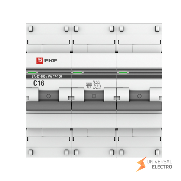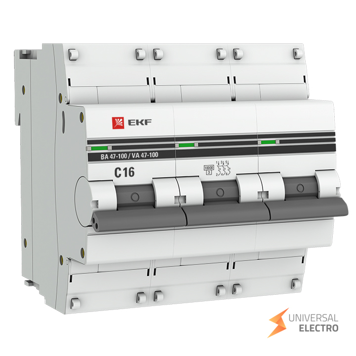 Автоматический выключатель 3P 16А (C) 10kA ВА 47-100 EKF PROxima предназначен для защиты электрических цепей от перегрузок и коротких замыканий. Он оснащен тремя полюсами и рассчитан на номинальный ток 16 ампер. Класс характеристики C обеспечивает защиту цепей с умеренными пусковыми токами. Выключатель способен отключать токи короткого замыкания до 10 кА.