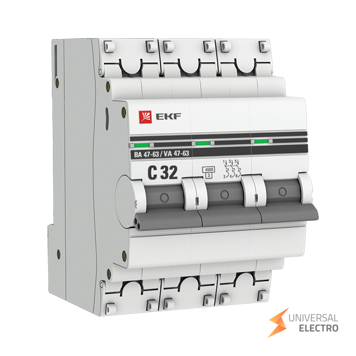 Автоматический выключатель 3P 32А (C) 4,5kA ВА 47-63 EKF PROxima предназначен для защиты электрических цепей от перегрузок и коротких замыканий. Он рассчитан на номинальный ток 32 ампера и обладает характеристикой срабатывания типа C. Устройство подходит для использования в промышленных и бытовых электросетях, обеспечивая надежную защиту и безопасность эксплуатации.