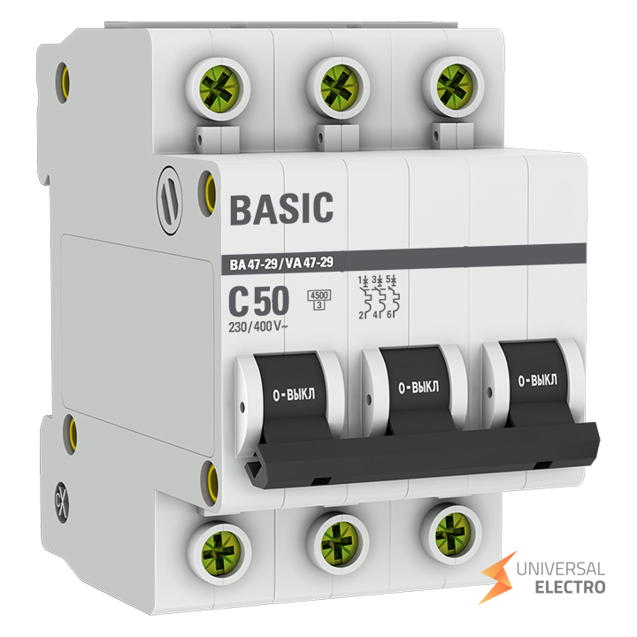 Автоматический выключатель 3P 50А (C) 4,5кА ВА 47-29 Basic предназначен для защиты электрических цепей от перегрузок и коротких замыканий. Он имеет три полюса и рассчитан на номинальный ток 50 ампер. Класс характеристики C позволяет использовать его в цепях с умеренными пусковыми токами. Выключатель способен выдерживать ток короткого замыкания до 4,5 кА.