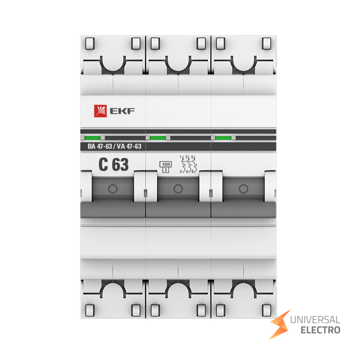 Автоматический выключатель 3P 63А (C) 4,5kA ВА 47-63 EKF PROxima предназначен для защиты электрических цепей от перегрузок и коротких замыканий. Он имеет три полюса и рассчитан на номинальный ток 63 ампера. Устройство обладает отключающей способностью 4,5 кА, что делает его подходящим для использования в промышленных и коммерческих установках.