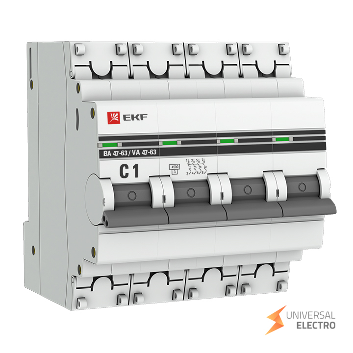 Автоматический выключатель EKF PROxima предназначен для защиты электрических цепей от перегрузок и коротких замыканий. Устройство имеет четыре полюса и номинальный ток 1 ампер. Срабатывание происходит при токах, превышающих номинальный в 5-10 раз (характеристика C). Выключатель способен отключать токи короткого замыкания до 4,5 кА, что делает его подходящим для использования в бытовых и небольших коммерческих установках.