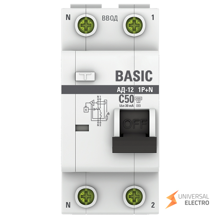 Автоматический выключатель дифференциального тока АД-12 Basic предназначен для защиты электрических цепей от перегрузок и коротких замыканий, а также для предотвращения утечек тока. Устройство имеет номинальный ток 50А и ток утечки 30мА. Тип АС обеспечивает защиту от переменного тока. Характеристика C подходит для цепей с умеренными пусковыми токами. Выключатель рассчитан на отключающую способность 4,5кА.