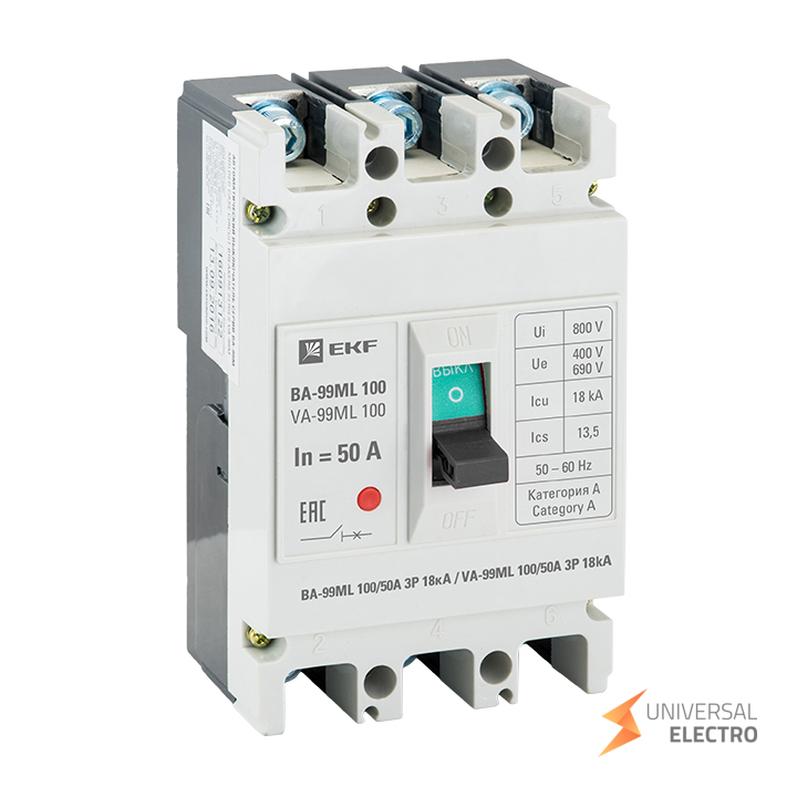 Автоматический выключатель ВА-99МL от EKF предназначен для защиты электрических цепей от перегрузок и коротких замыканий. Модель рассчитана на номинальный ток 50А и имеет трехполюсное исполнение. Способен выдерживать токи короткого замыкания до 18кА. Подходит для использования в промышленных и коммерческих установках, обеспечивая надежную защиту и безопасность.