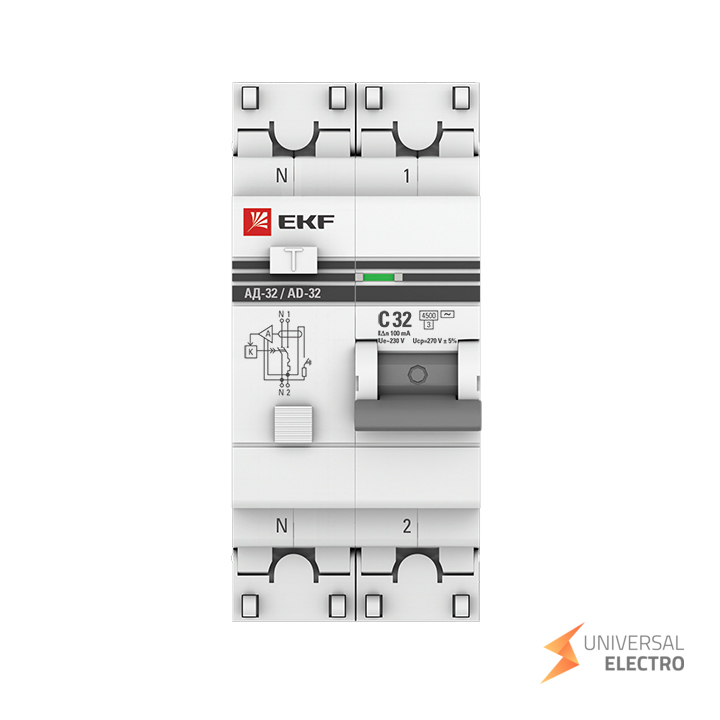 Дифференциальный автомат АД-32 1P+N от EKF PROxima предназначен для защиты электрических цепей от перегрузок и коротких замыканий. Он поддерживает номинальный ток 32А и порог утечки 100мА. Устройство оснащено характеристикой C и предназначено для работы в сетях переменного тока. Электронная схема обеспечивает надежную защиту при напряжении до 270В. Максимальная отключающая способность составляет 4,5кА.
