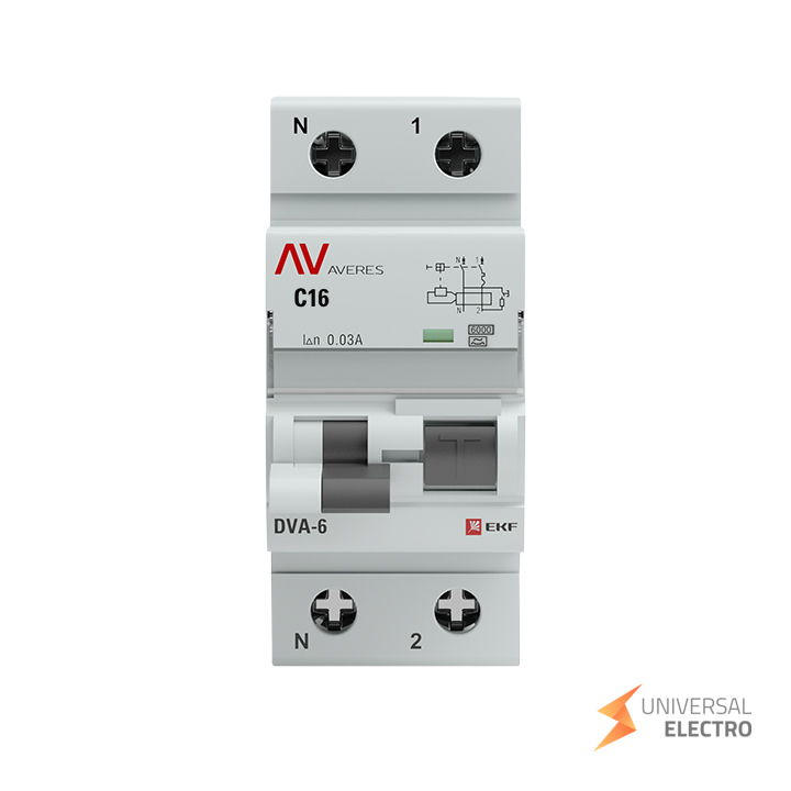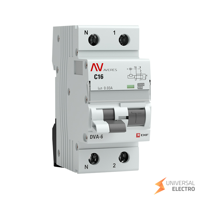 Дифференциальный автомат DVA-6 от EKF AVERES предназначен для защиты электрических цепей от перегрузок и коротких замыканий, а также для предотвращения утечек тока. Он оснащен одной фазой и нейтралью, рассчитан на ток до 16А и утечку 30мА. Автоматическая защита срабатывает при токах короткого замыкания до 6кА, что делает его подходящим для использования в жилых и коммерческих помещениях.