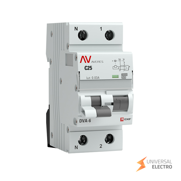 Дифференциальный автомат DVA-6 1P+N от EKF AVERES предназначен для защиты электрических цепей от перегрузок, коротких замыканий и утечек тока. Он имеет номинальный ток 25А и порог срабатывания 30мА, что делает его подходящим для бытовых и коммерческих установок. Автомат рассчитан на отключающую способность 6кА, обеспечивая надежную защиту в стандартных условиях эксплуатации.