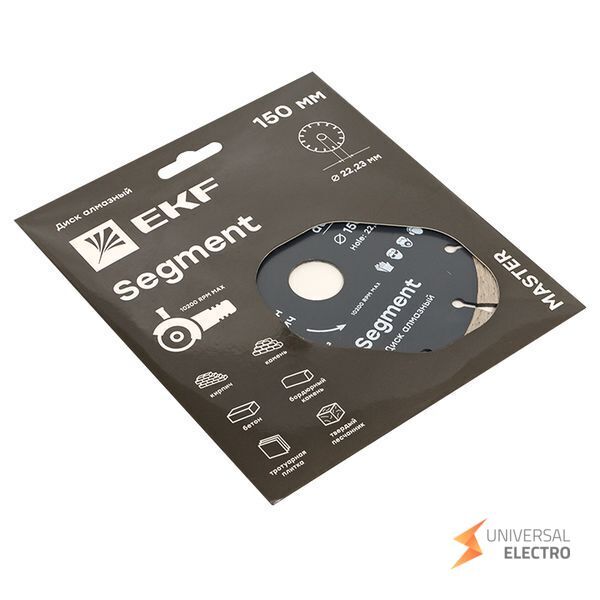 Алмазный диск Segment EKF Master диаметром 150 мм и посадочным отверстием 22,23 мм предназначен для резки твердых строительных материалов. Используется в профессиональных и бытовых условиях для работы с бетоном, кирпичом и камнем. Обеспечивает высокую точность и скорость резки благодаря сегментированному краю, что способствует эффективному удалению пыли и предотвращает перегрев.