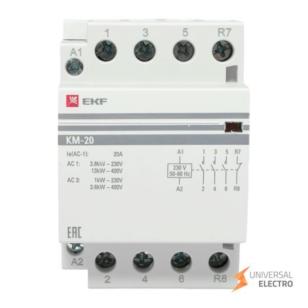 Контактор модульный КМ 20А 3NО+NC от EKF PROxima предназначен для коммутации электрических цепей в системах автоматизации и управления. Он оснащен тремя нормально открытыми и одним нормально закрытым контактом. Устройство монтируется на DIN-рейку и подходит для использования в распределительных щитах и панелях. Обеспечивает надежное переключение токов до 20 ампер.