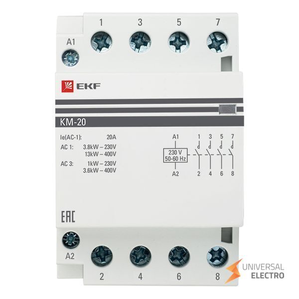 Контактор модульный КМ 20А 4NO от EKF PROxima предназначен для коммутации электрических цепей с номинальным током до 20 ампер. Он оснащен четырьмя нормально открытыми контактами и занимает три модуля в распределительном щите. Применяется в системах автоматизации и управления для надежного переключения электрических нагрузок.