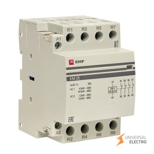 Контактор модульный КМ 25А 4NC от EKF PROxima предназначен для коммутации электрических цепей в распределительных устройствах. Обеспечивает надежное размыкание и замыкание цепей с номинальным током до 25 ампер. Имеет четыре нормально замкнутых контакта и занимает три модуля в щитовом оборудовании. Подходит для использования в системах автоматизации и управления.
