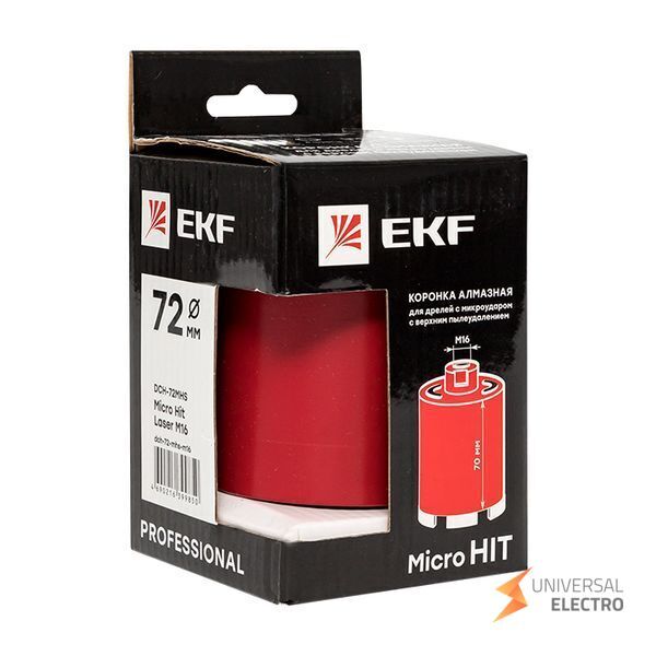 Алмазная коронка DCH-72MHS Micro Hit Laser M16 от EKF Professional предназначена для использования с дрелями, оснащенными функцией микроудара. Она обеспечивает эффективное сверление в твердых материалах благодаря алмазному напылению. Верхнее пылеудаление способствует чистоте рабочего места, уменьшая количество пыли. Подходит для профессионального использования в строительстве и ремонте.