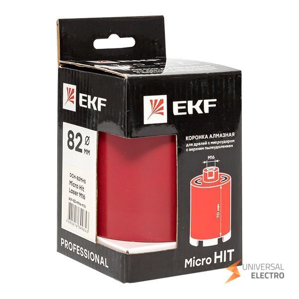 Алмазная коронка DCH-82MHS Micro Hit Laser M16 от EKF Professional предназначена для использования с дрелями, оснащенными функцией микроудара. Она обеспечивает эффективное сверление твердых материалов благодаря лазерной технологии. Верхнее пылеудаление способствует чистоте рабочей зоны и улучшает видимость. Подходит для профессионального использования в строительстве и ремонте.