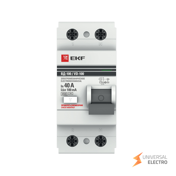 Устройство защитного отключения (УЗО) ВД-100 2P от EKF PROxima предназначено для защиты электрических цепей от токов утечки, предотвращая возможные поражения электрическим током и возгорания. Оно имеет номинальный ток 40А и ток утечки 100мА. Двухполюсная конструкция позволяет использовать его в однофазных сетях. Электромеханический принцип действия обеспечивает надежную работу даже при отсутствии напряжения.