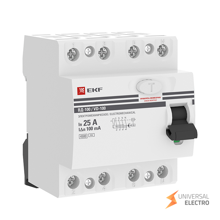 Устройство защитного отключения УЗО ВД-100 4P 25А/100мА от EKF PROxima предназначено для защиты электрических цепей от утечек тока. Оно обеспечивает безопасность эксплуатации электрических систем, предотвращая поражение электрическим током и снижая риск возгораний. Устройство имеет четыре полюса и рассчитано на номинальный ток 25А с током утечки 100мА. Электромеханическая конструкция позволяет использовать его в различных условиях эксплуатации.