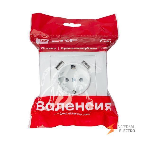 Одноместная розетка Валенсия с заземлением рассчитана на ток до 16А. Изделие выполнено в белом цвете и оснащено защитными шторками для повышения безопасности. Дополнительно предусмотрены два USB-порта с выходным током 2,1А, что позволяет заряжать устройства без использования адаптеров. Розетка подходит для установки в жилых и офисных помещениях.
