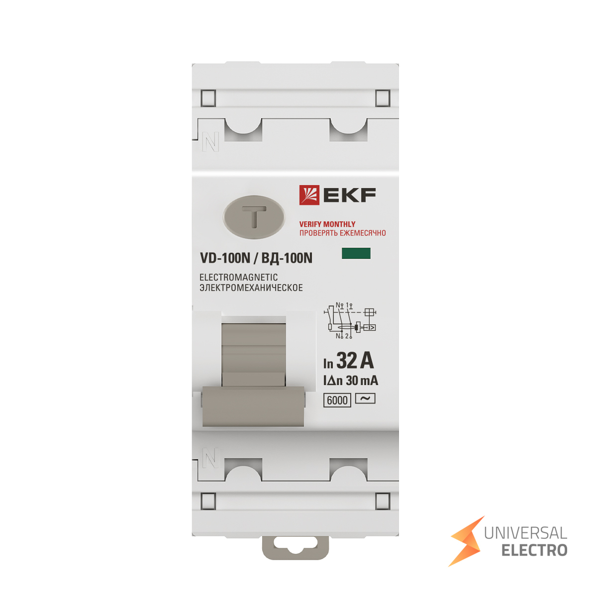 Выключатель дифференциального тока ВД-100N 2P 32А 30мА тип AC от PROXIMA EKF предназначен для защиты электрических цепей от утечек тока, коротких замыканий и перегрузок. Он оснащен электромеханическим механизмом и рассчитан на ток утечки 30 мА. Устройство имеет номинальный ток 32А и способно выдерживать ток короткого замыкания до 6 кА.