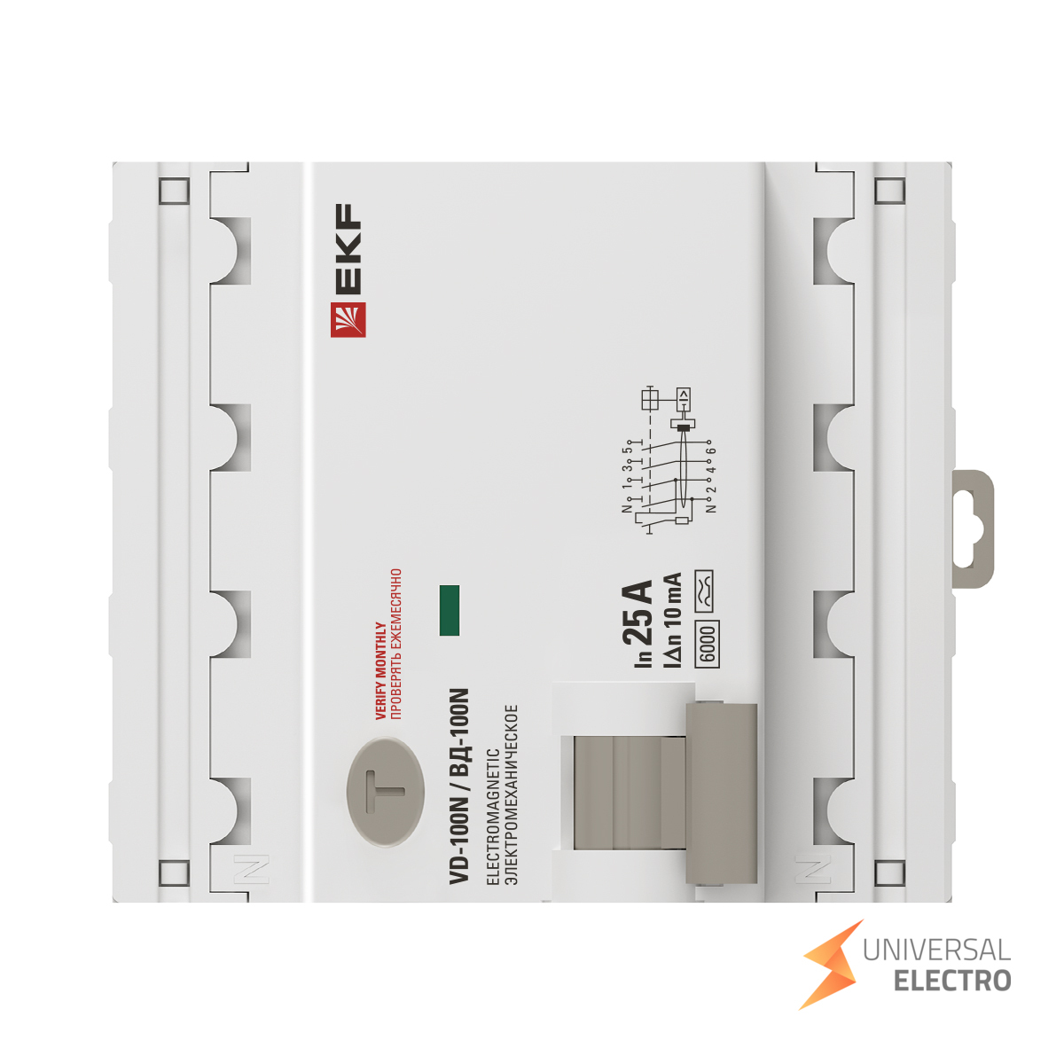 Выключатель дифференциального тока ВД-100N 4P 25А 10мА тип A от EKF предназначен для защиты электрических цепей от токов утечки и предотвращения поражения электрическим током. Он оснащен электромеханическим механизмом и рассчитан на номинальный ток 25А. Устройство поддерживает отключающую способность до 6кА и обеспечивает надежную защиту в бытовых и промышленных установках.