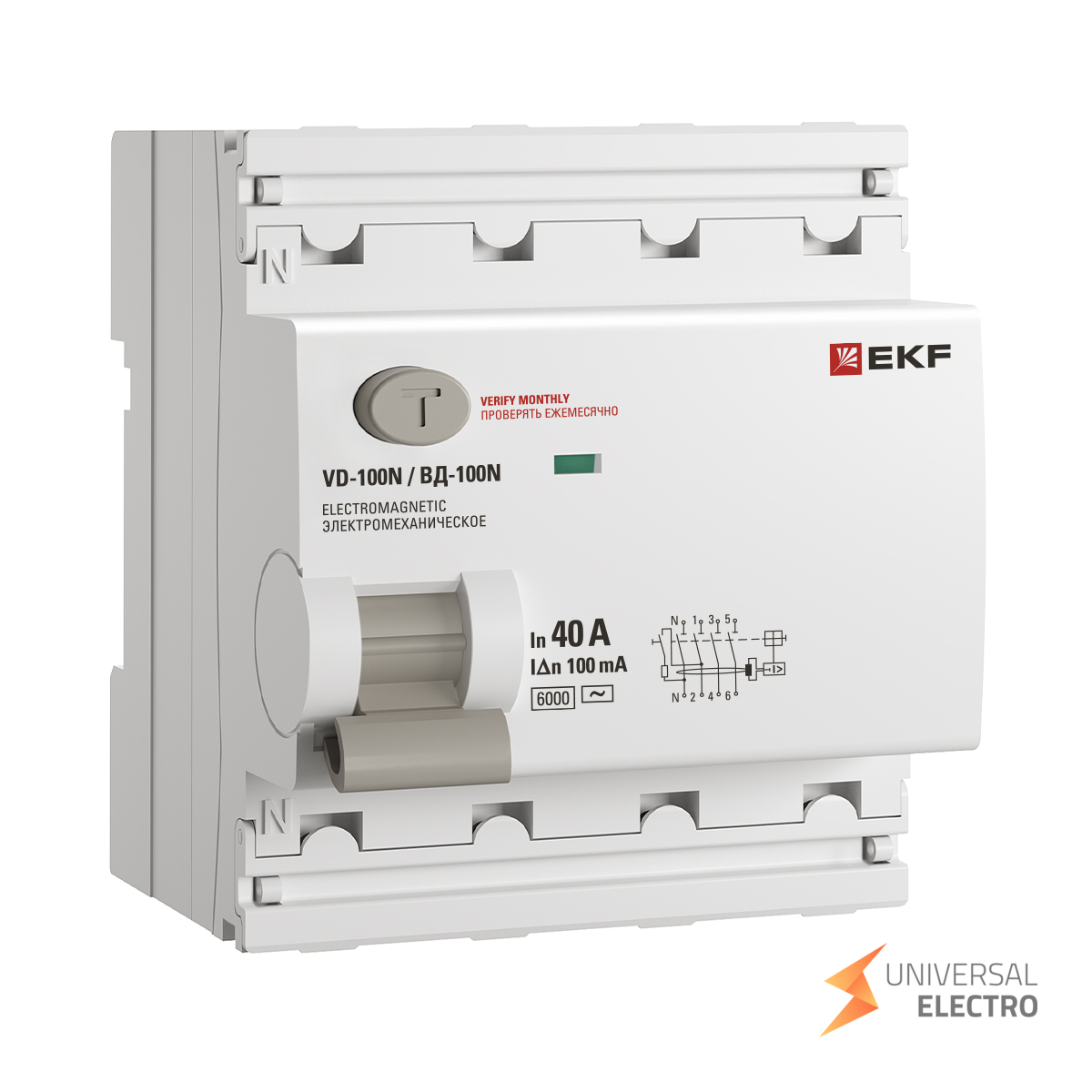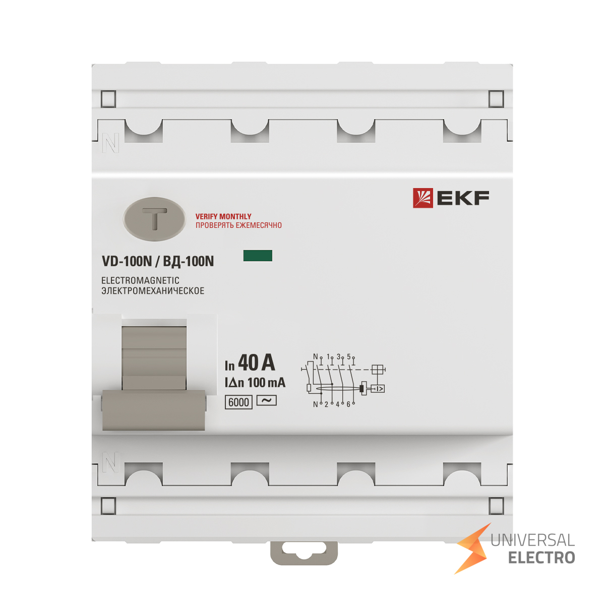 Выключатель дифференциального тока ВД-100N предназначен для защиты электрических цепей от утечек тока, перегрузок и коротких замыканий. Обеспечивает безопасность в бытовых и промышленных установках. Имеет 4 полюса, номинальный ток 40А и чувствительность 100мА. Тип AC подходит для переменного тока. Электромеханический механизм рассчитан на отключающую способность до 6кА.
