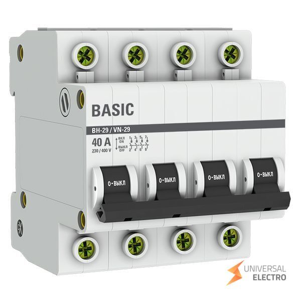 Выключатель нагрузки 4P 40А ВН-29 Basic предназначен для управления и защиты электрических цепей с номинальным током до 40 ампер. Обеспечивает надежное отключение и подключение нагрузки в трехфазных системах. Устройство подходит для использования в бытовых и промышленных установках, обеспечивая безопасность и долговечность электрических систем.